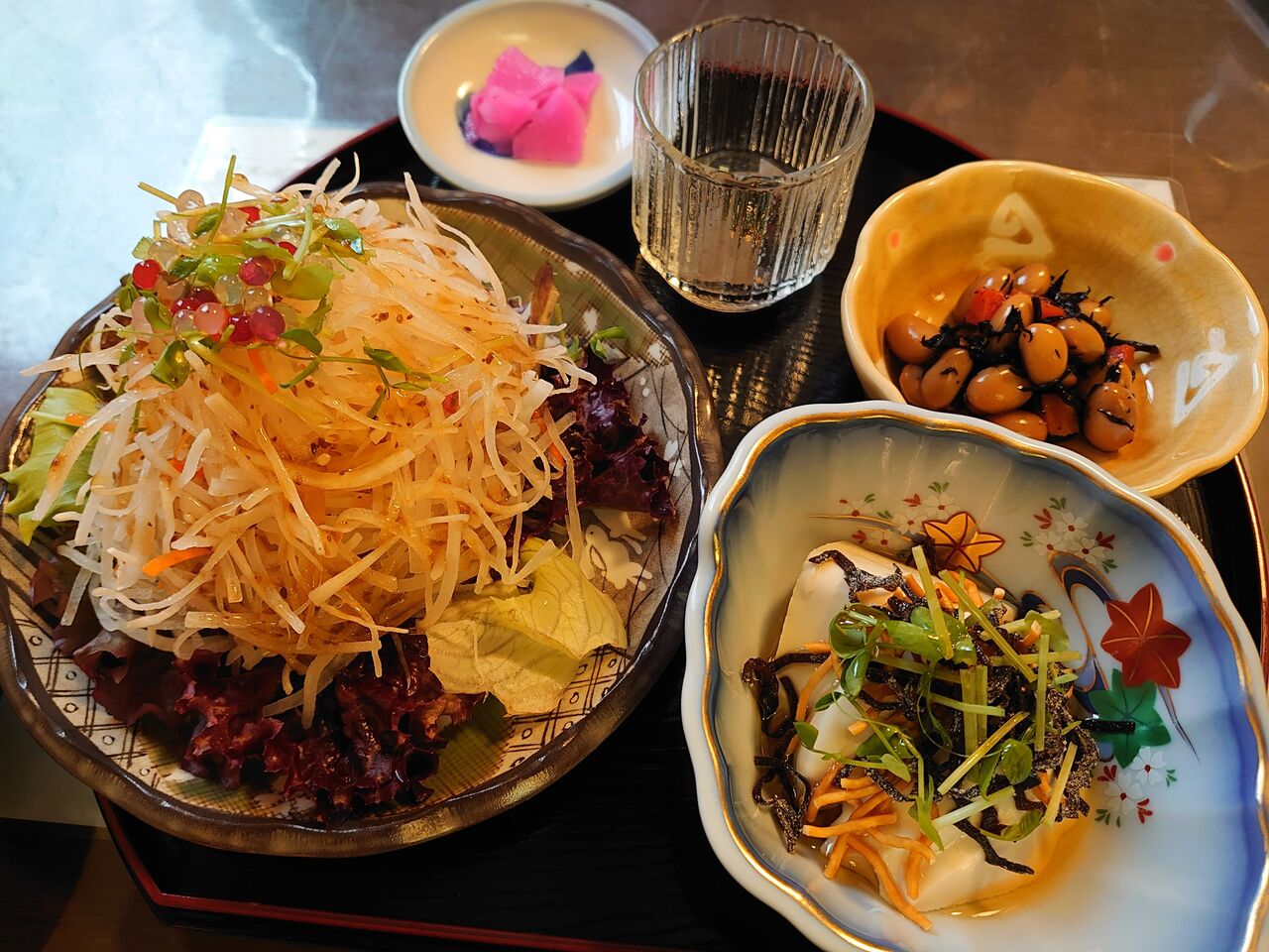 たっぷりの大根サラダに、塩こんぶを載せた冷や奴。豆の煮物に…