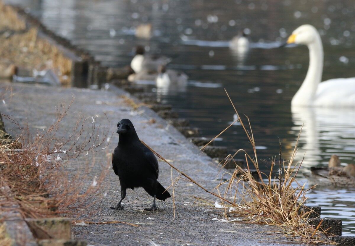 白鳥や鴨に紛れて、ちゃっかりカラスもパンを頂いていました。