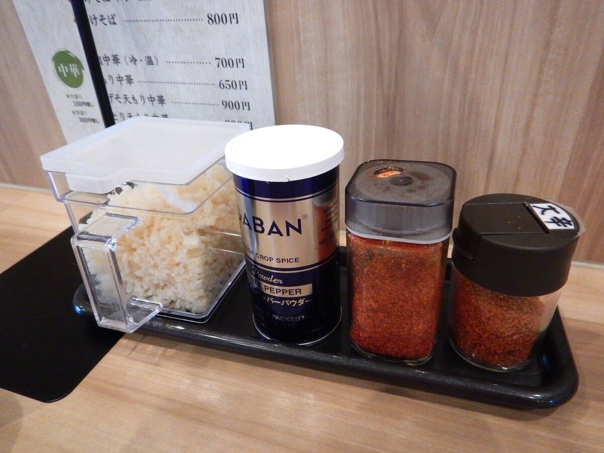 卓上には胡椒や一味唐辛子に加え、天かすも準備してあります。