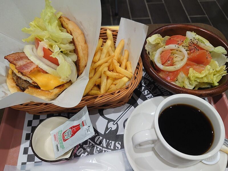 佐世保バーガー、ポテト、サラダ、そしてホットコーヒーで880円。