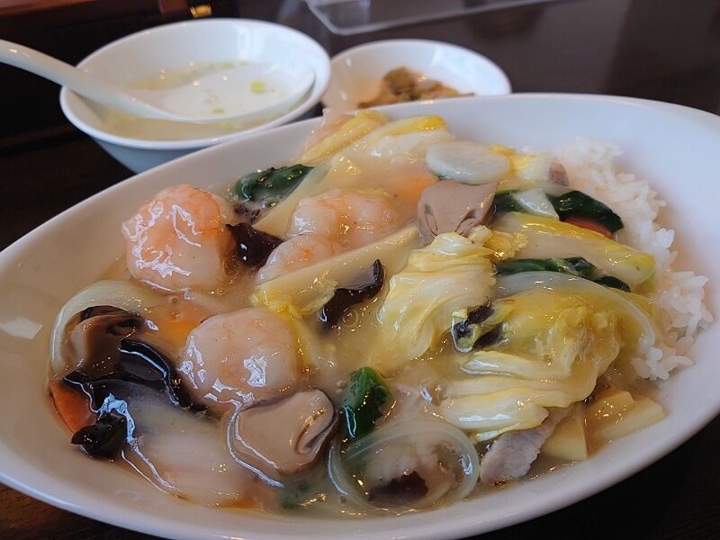 こちらではもう一種類、醤油味の中華飯もあったんだけど、なんとなくこの日は塩味ベースの海老中華が食べたい気分だったんだよ。