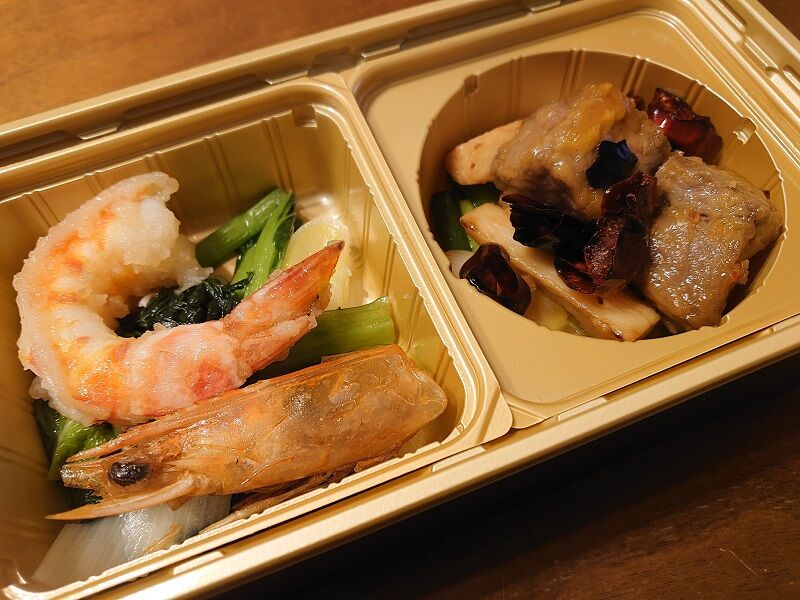 真ん中の二段目。牛肉とエビの中華料理だ。