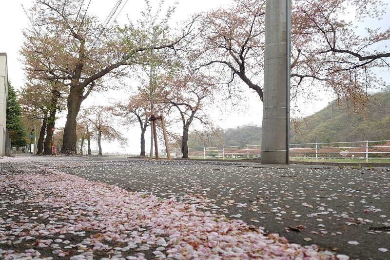 道路の端に吹き寄せられた桜の花びらが凄かったですよ。