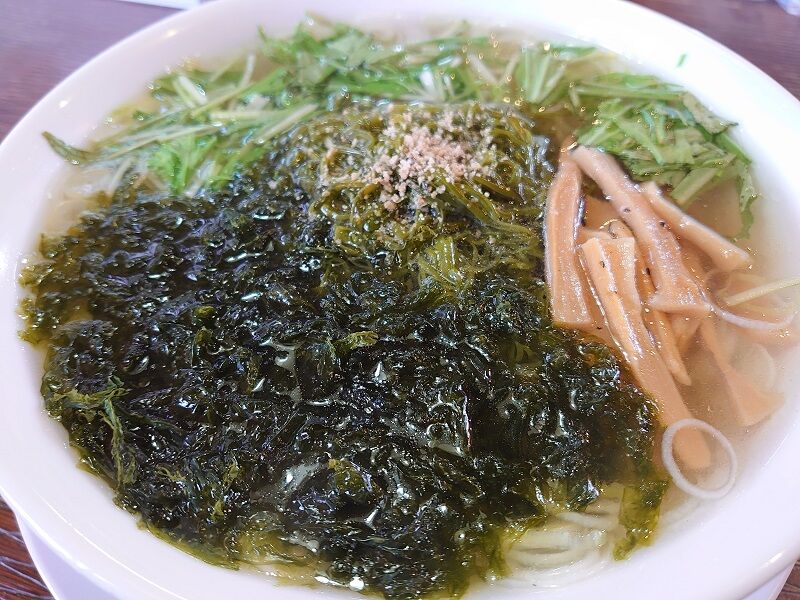 こちらがそのめかぶ塩中華。塩中華だけあって本当に澄んだスープです。