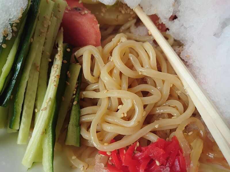 この氷ラーメンは「冷やし中華風つけめん」だそうなので、ご覧のとおりかき氷の下にはほぼ冷やし中華が埋まってます♪