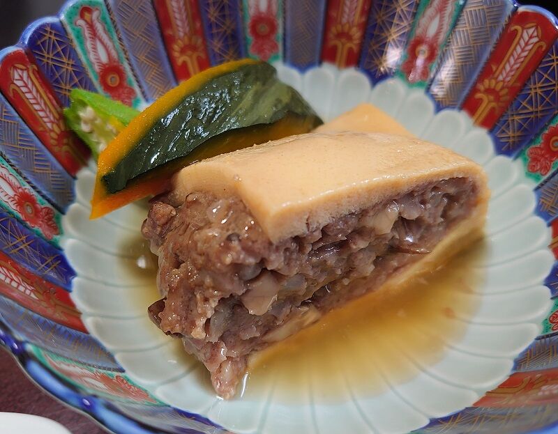 次は、高野豆腐(凍み豆腐)でお肉を挟んだ料理と、カボチャにオクラ。