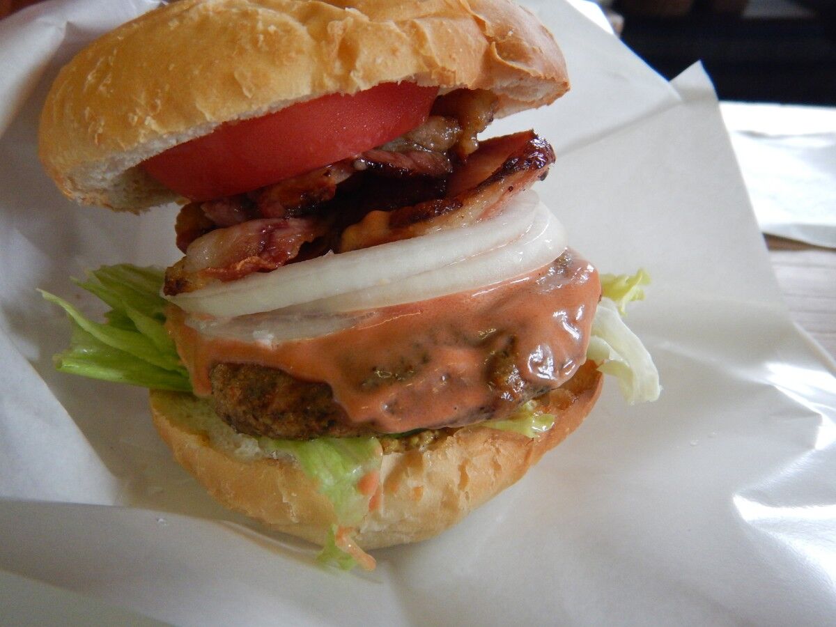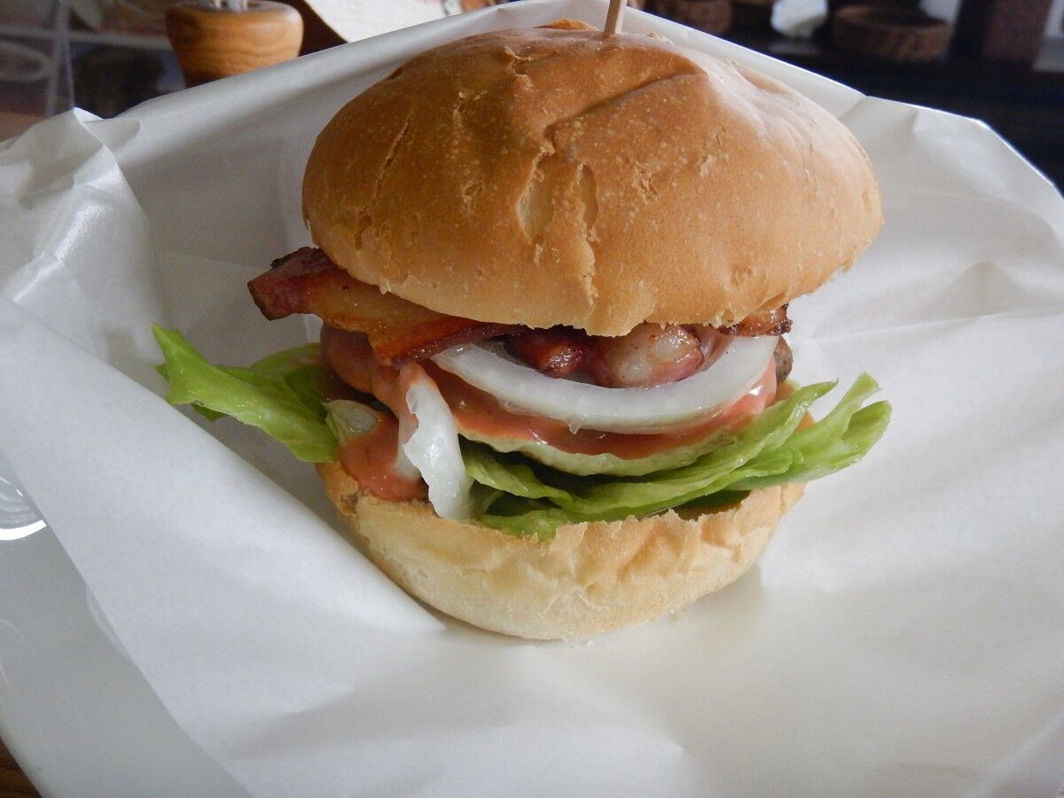 具は香ばしく焼かれた肉厚ベーコンに豚肉のパテが挟まれています。