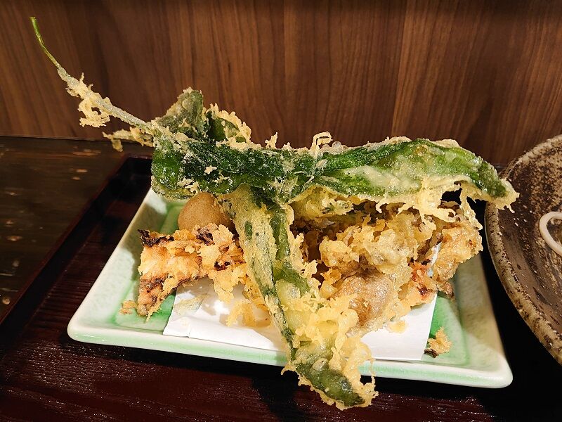 ゲソがメインと思われ、それにこの長い葉っぱ的な天ぷらが2枚に舞茸、カボチャとそばがきの天ぷらも一つ。