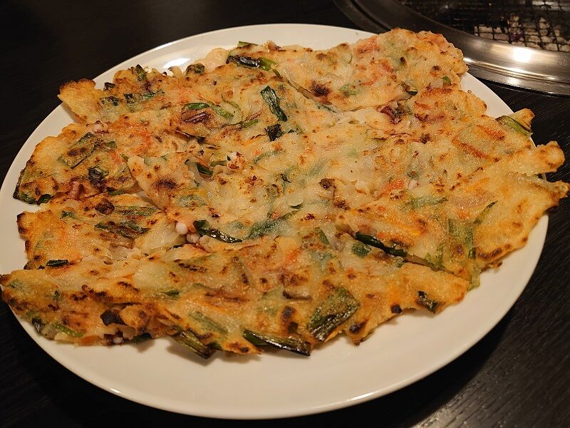 いつもだったら冷麺とかをいただくところなんだけど、今回はけっこうおなかいっぱいになってたからそこまではいいかなーと。それでみんなでチヂミ1枚をシェアしたんだけど、これでも十分間に合ったな。