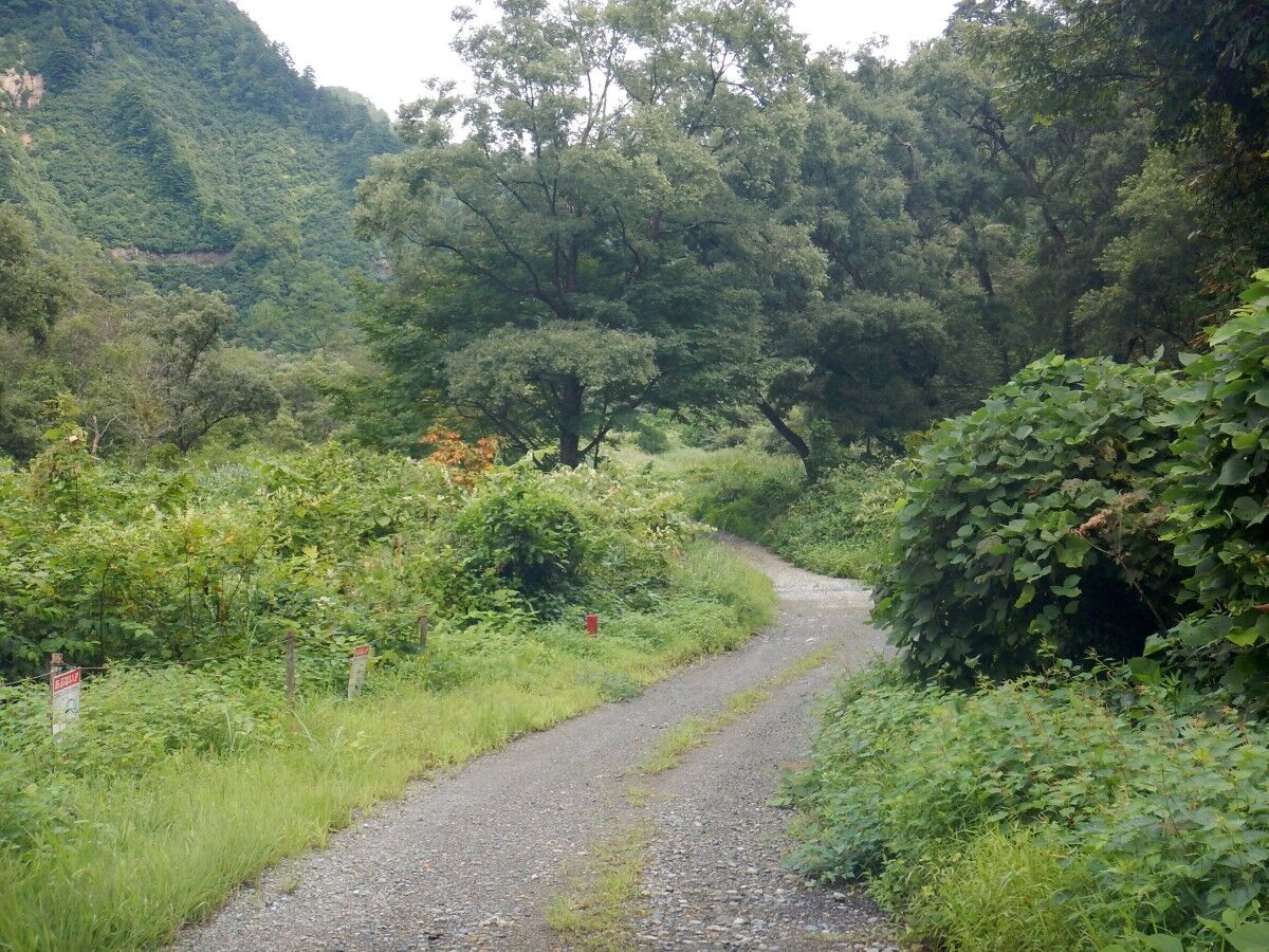 発電所近くからすでに舗装は無く、うっそうと茂った草に囲まれた砂利道を進んでいきます。
