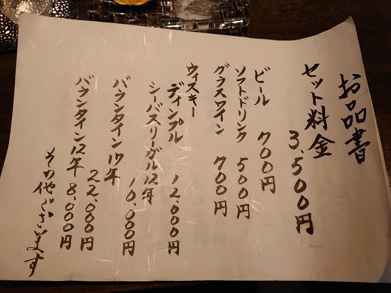 僕、あんまり「セット料金」というものに詳しくないんだけど、ボトルキープについてはこの1枚目が一番お高いやつ。2枚目以降には焼酎とかもリストアップされてて、そちらだと5000円とかでキープできるものもありましたよ♪
