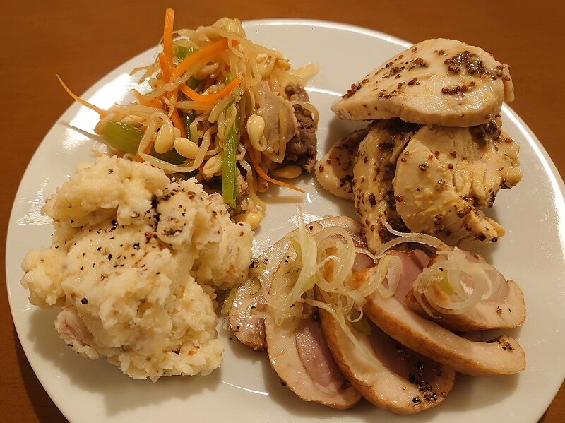 オトナのポテサラ、豚タンのナムル、鶏のハニーマスタード、合鴨のスモーク。