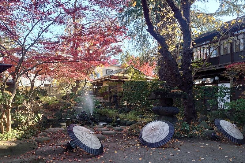 和傘のしつらえがいい感じですね。紅葉した葉っぱがもっと落ちてたらさらに良かった。