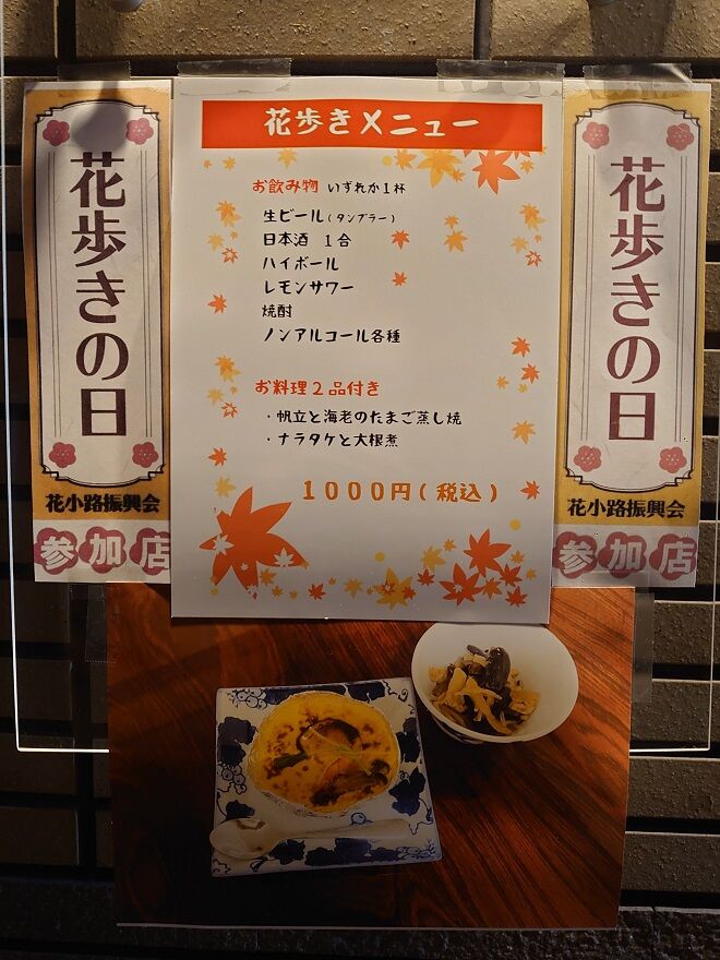 花あるきは、お店ごとに2000円以下で飲めるメニューを設定してくれてるんだけど、なんとこちらは1000円でのメニュー設定をしてくれてますψ(`∇´)ψ