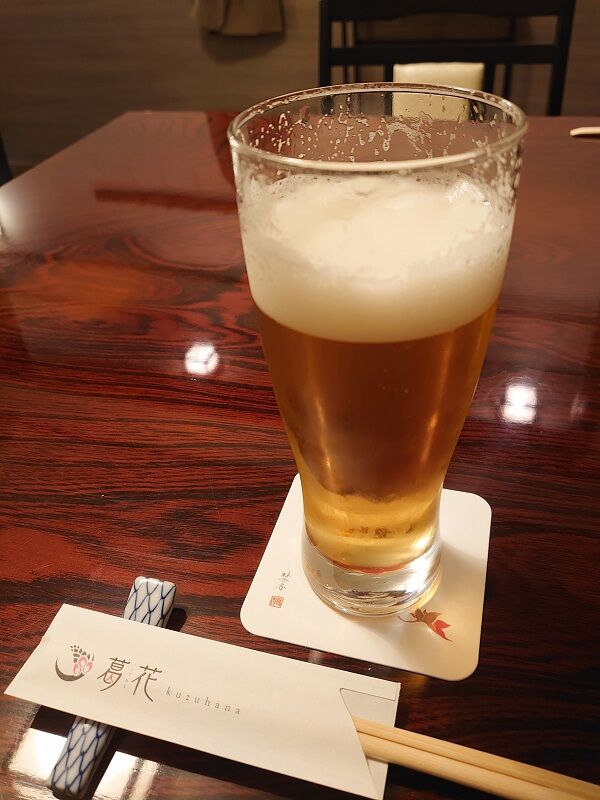 やっぱり最初はビールでスタート。とはいえ、すでに振る舞いで日本酒と赤ワインはけっこう飲んじゃってるんだけどね(^^;
