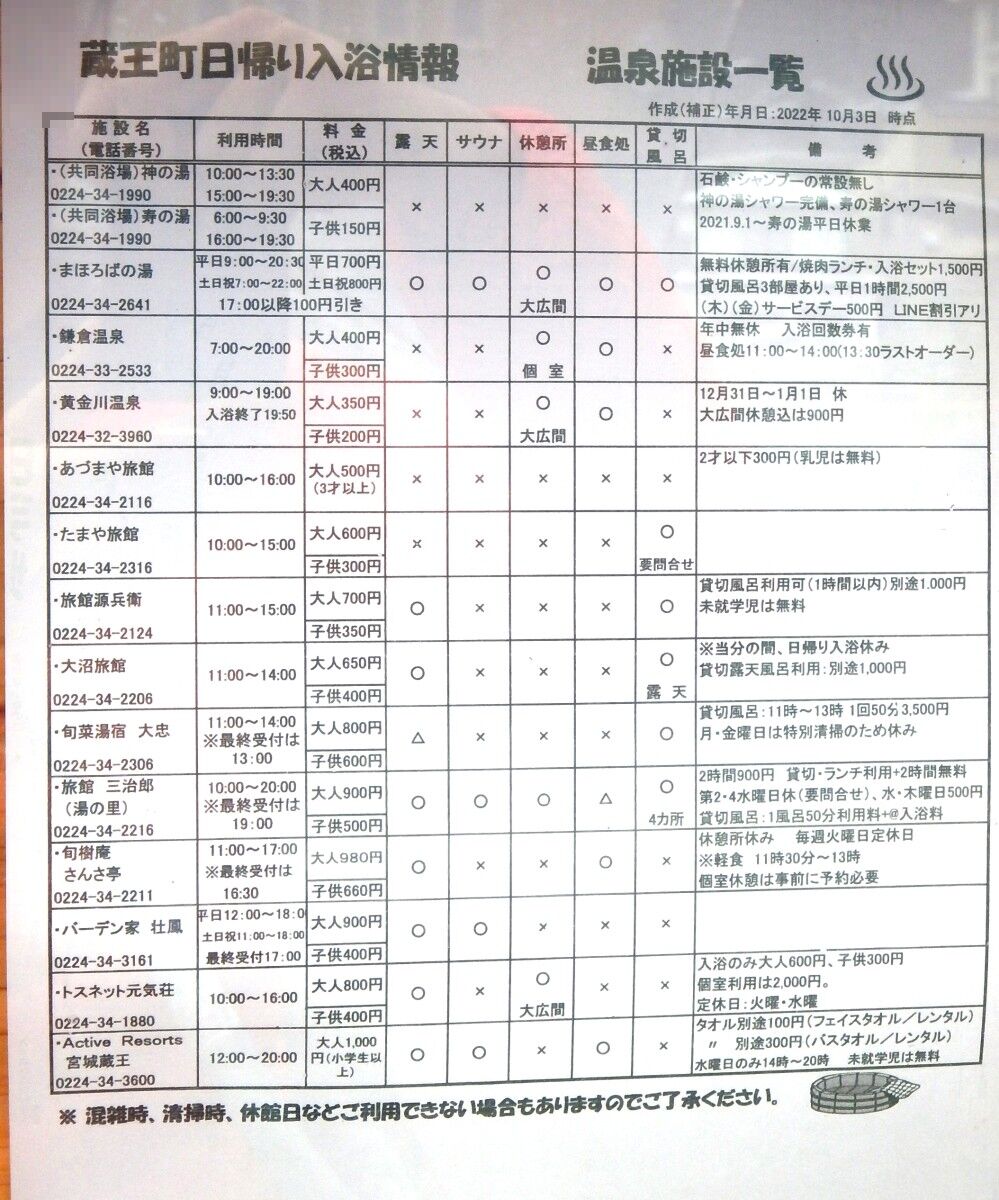 観光案内所に旅館等の日帰り入浴情報が掲示されていました。