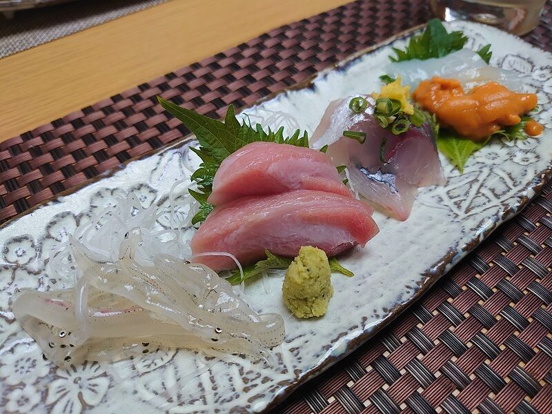 お刺し身は4種盛り。白魚にマグロのトロ、何だったかの白身魚に、一番奥がイカとウニ。