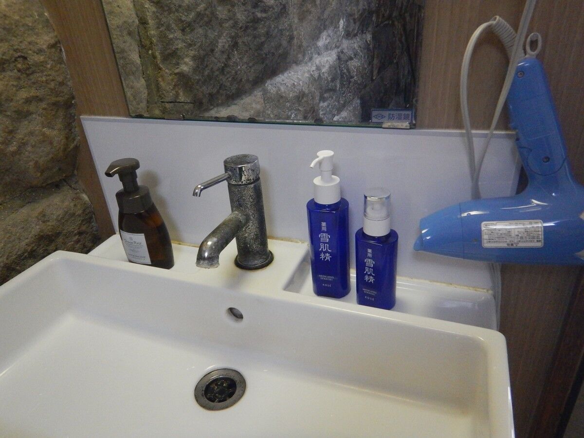 洗面台にはドライヤーがあり、化粧水も置いてあります。