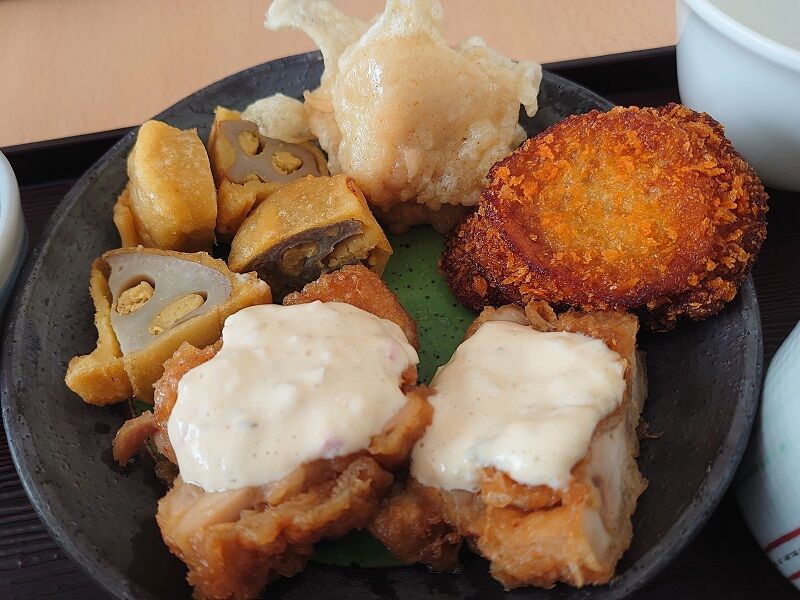 時計回りに同じく大分のぎょろっけ、宮崎代表のチキン南蛮、熊本代表の辛子れんこん。