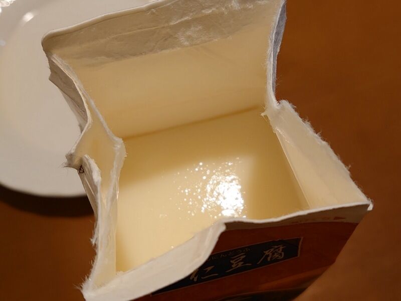 紙パックと杏仁豆腐との間をナイフか何かで切り離して、隙間に空気を入れれば良かったんだけど、ソレをしなかったから途中でちぎれるみたいに割れちゃったんだな…