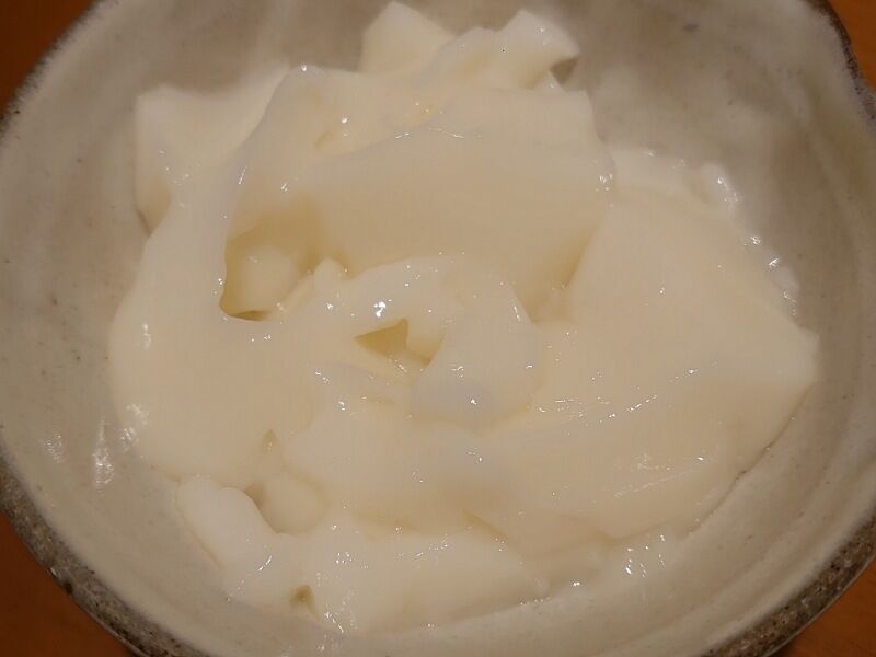 結果、残った部分をまたスプーンでほじくり出したら、こんな不思議な形状の杏仁豆腐になりました(^^;