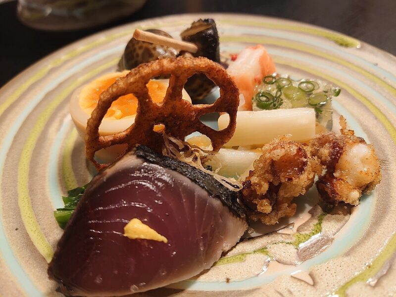 つぶ貝はちょっと辛みのある味付けで、カツオはちゃんと藁焼きしてある本格派。