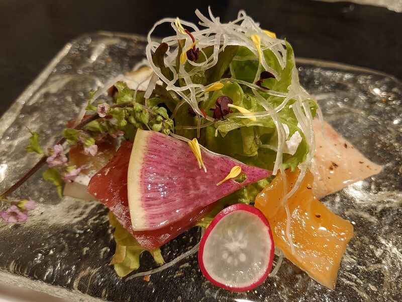 続いてはサラダ。なんだけど、数種類の刺身も合わせてカルパッチョ風に出していただきました。
