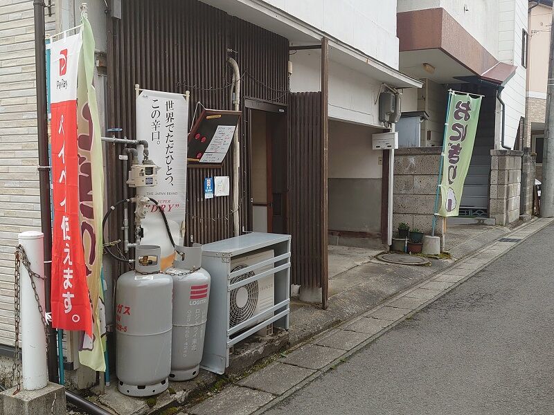 そこから通りの反対側を見ると、細い路地の先にペイペイ使えます、ののぼりが立ってた。