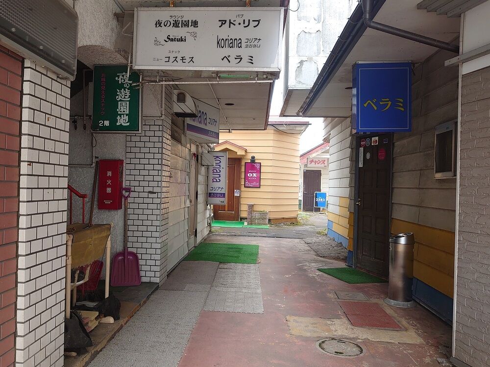 雑居ビル的にいろんなスナックが連なっている感じだけど、いくつもある看板の中で最も僕の目を引いたのは、やっぱり「夜の遊園地」さん!
