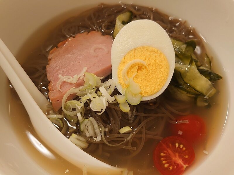 さくらさんの冷麺は韓国冷麺。そば粉の入った細いやつね。このタイプの冷麺って辛みがなくて、ネットで見かけた口コミでは「キムチを頼んでおきましょう」って書いてあったんですよね。