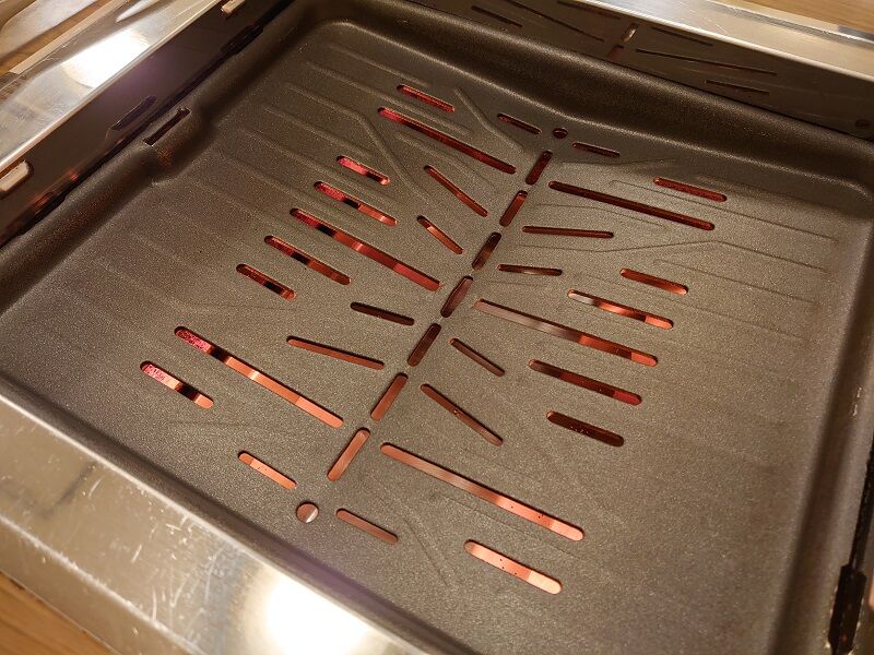 網じゃなくて、スリットの入った鉄板。しかもテフロン加工!