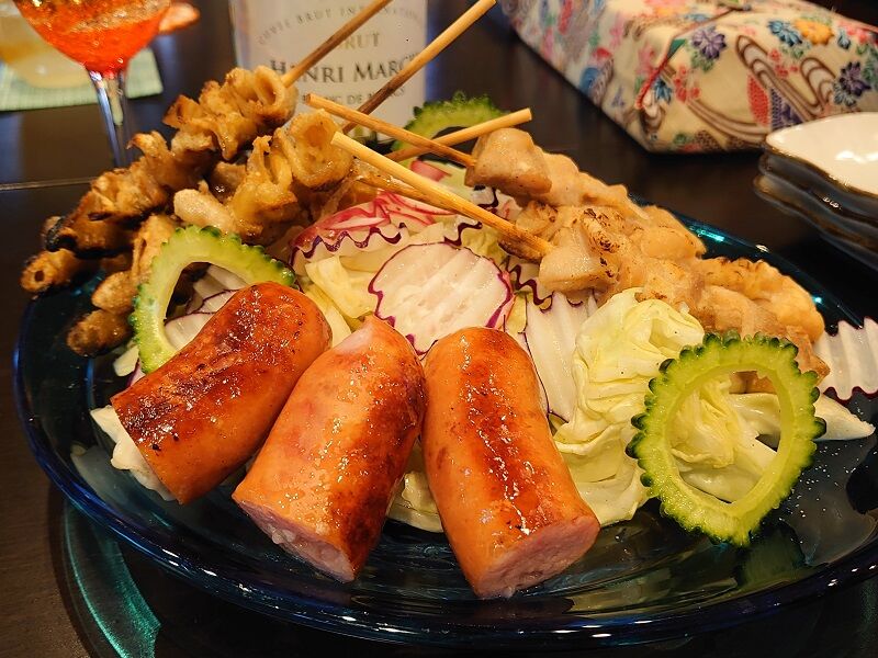 手前に見えるソーセージは、沖縄特産のアグー豚を使ったもの。