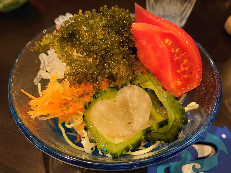 おまかせ料理の一皿目は、海ぶどうがのったサラダ。