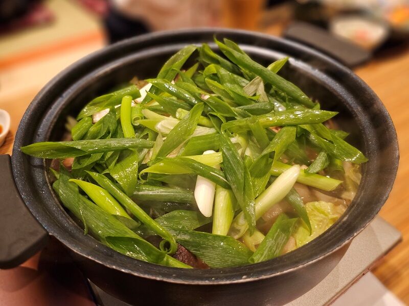 さっきの鴨鍋、鴨肉は下に沈めて、上にこの九条ネギをのせます。