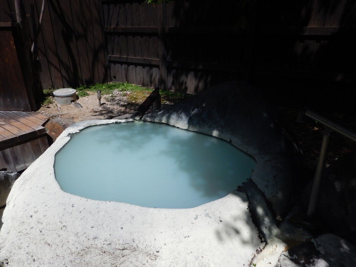 お湯は硫黄の香りが漂い、薄い青白い色に濃く濁っていました。