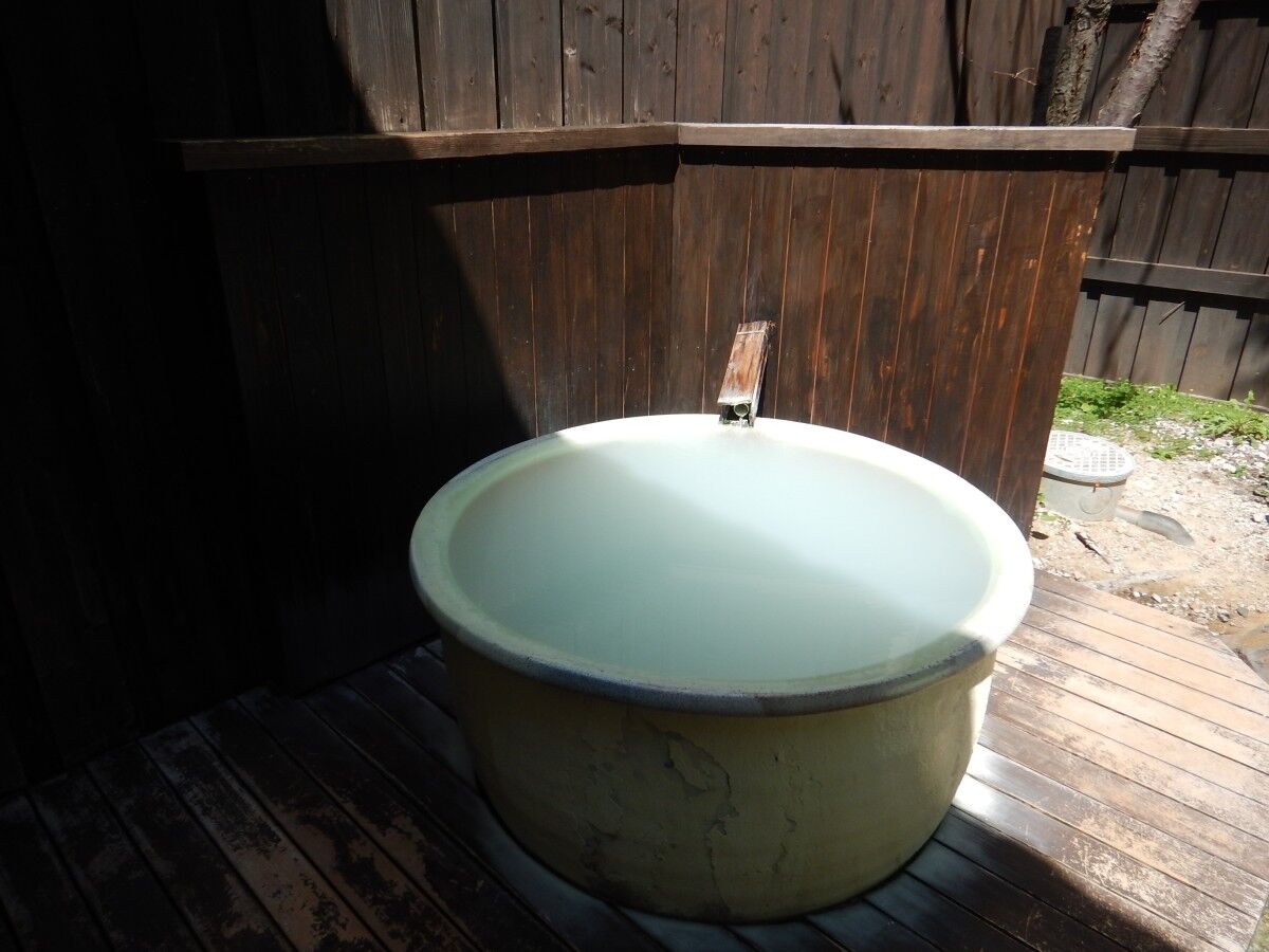 奥にあるのが陶器の湯舟。