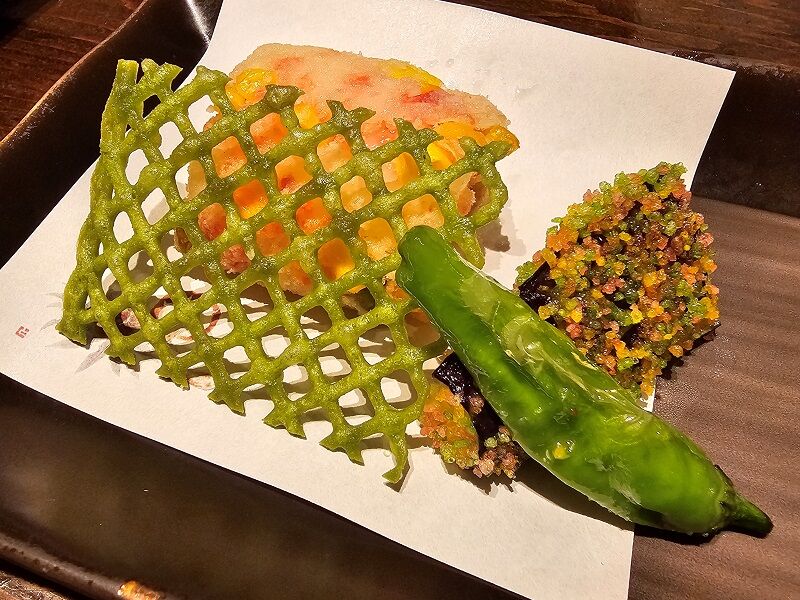 見た目のキレイさももちろんですが、格子状の揚げ物の後ろにある天ぷらがもちもちした食感が美味しかったんですよ。でも何の天ぷらだったのか、判別できなかったんですよね~。