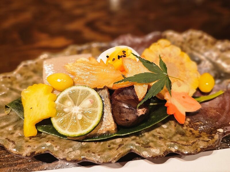 秋を感じさせる食材と、飾りのあしらい。さすがご主人、ホテルや割烹で腕を振るわれたというセンスの良さがうかがえますね。