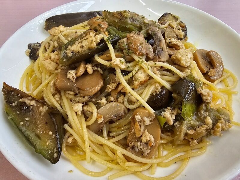 今日の日替わりパスタは鶏ひき肉とナスのパスタ。