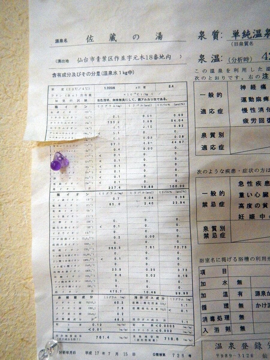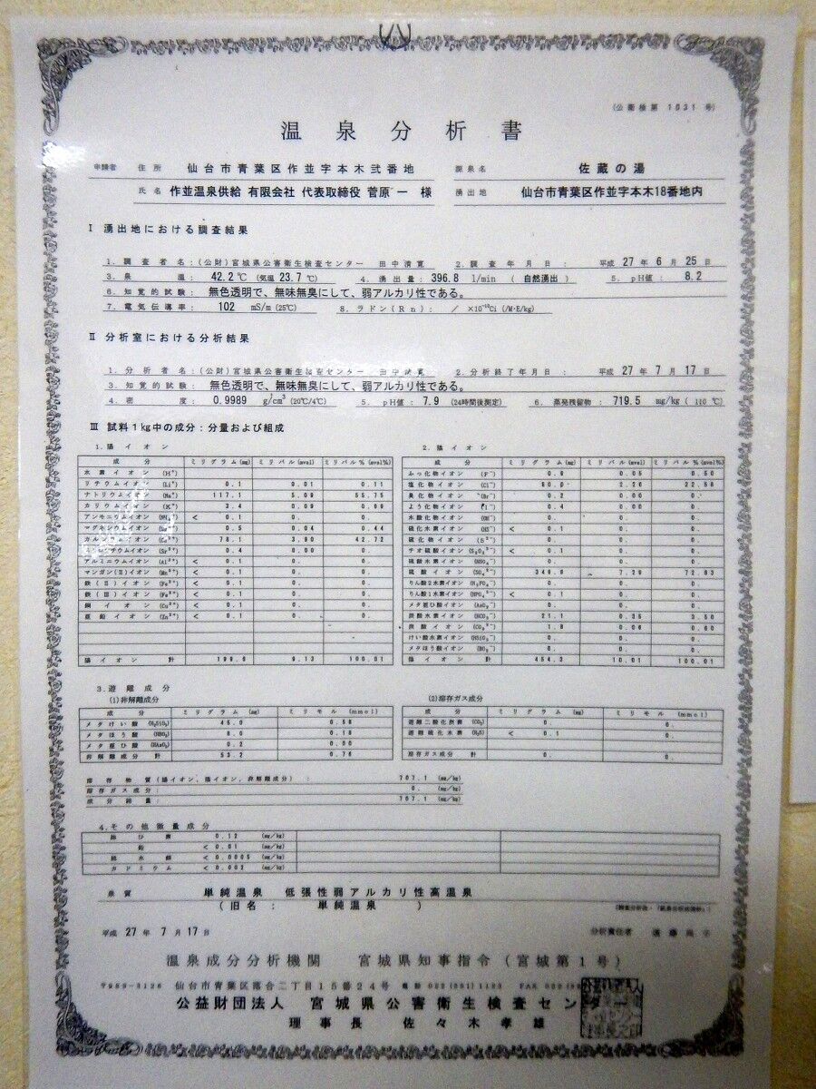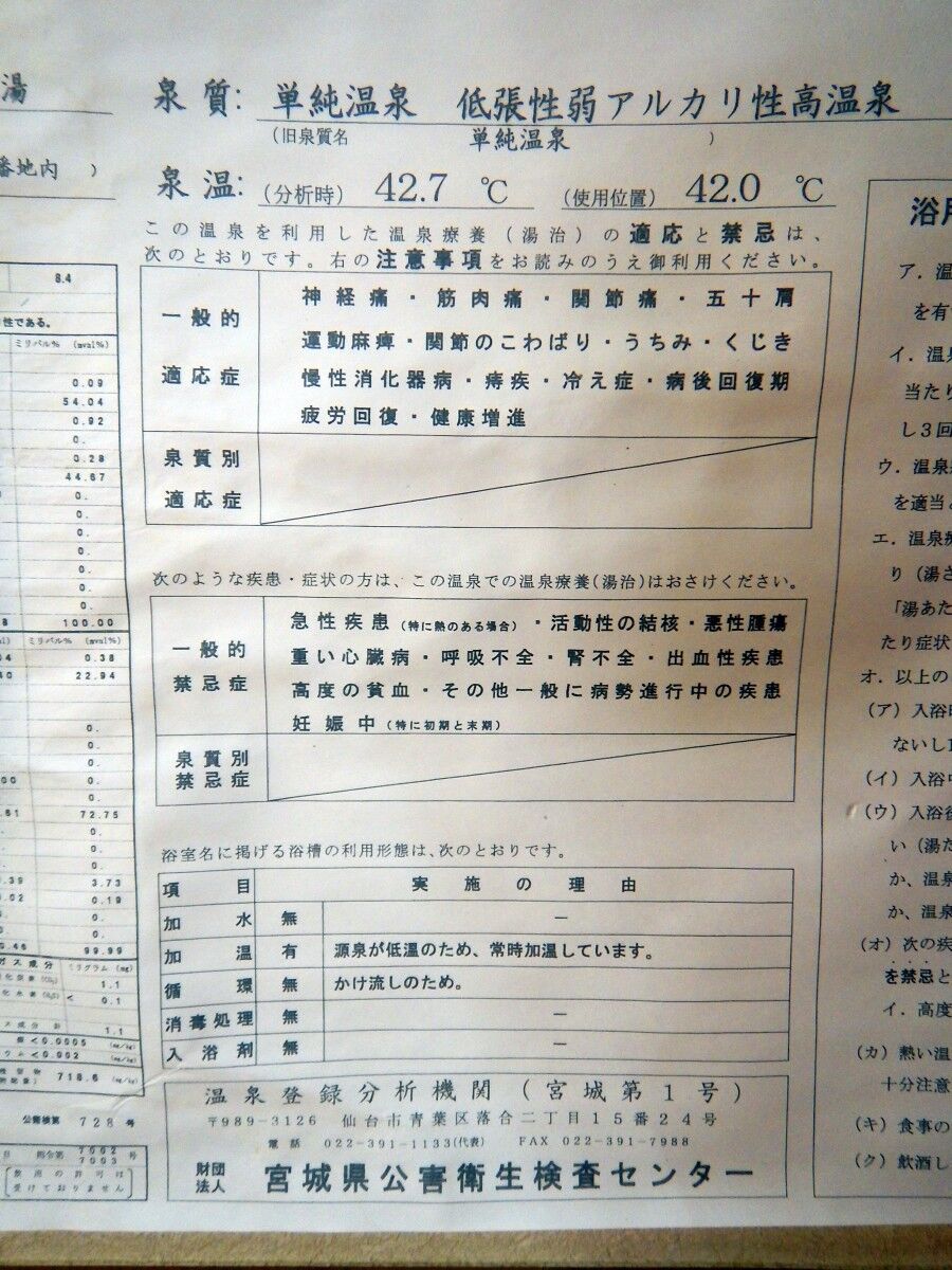 少々蒸発残留物が少ないため単純温泉となっていますが、成分構成は他の作並のお湯と似通っています。