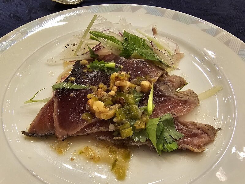 1品目は、こちらの「鰹のカルパッチョ 焼き霜仕立て 香味サラダ添え」。
