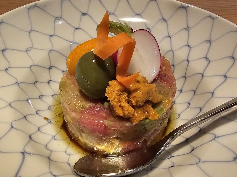 献立には本鮪、帆立、庄内柿とあるけど、さらにウニものってるし、オリーブの後ろには金柑のスライスもあって爽やかさを添えてくれてます。