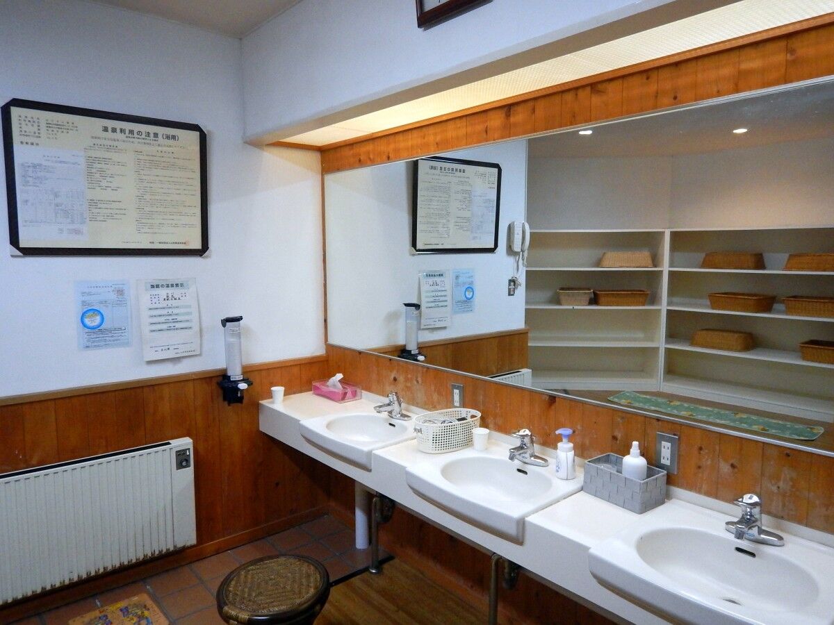 洗面台近くの壁には温泉成分表。