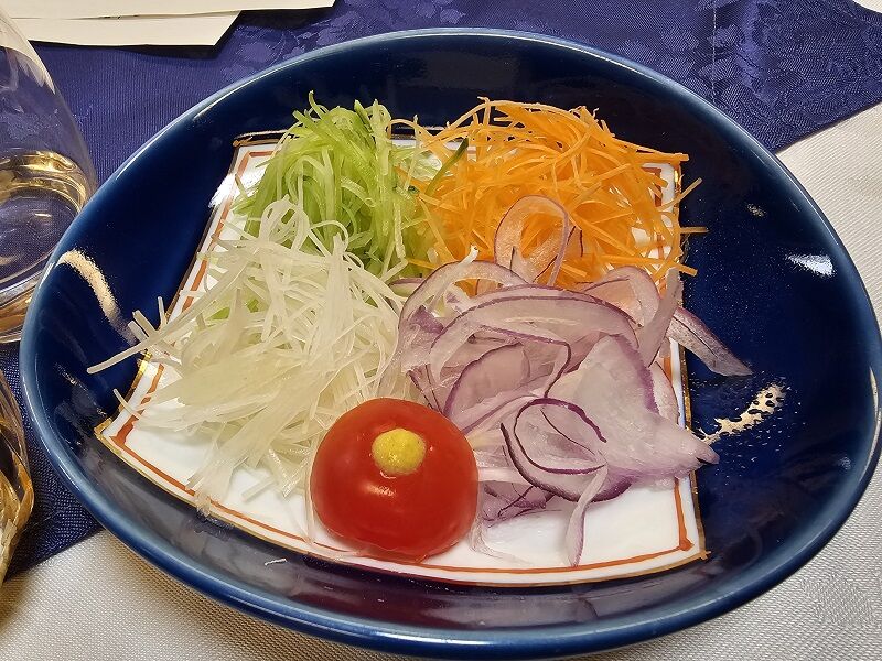 新鮮な野菜の千切り4種類。これをつゆにつけて食べるんだけど、手前の白っぽいヤツ、これなんだと思います?