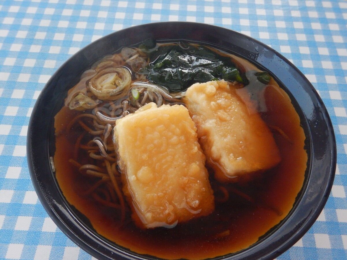 ネギとワカメのシンプルなかけそばにモチ天が2枚載っています。