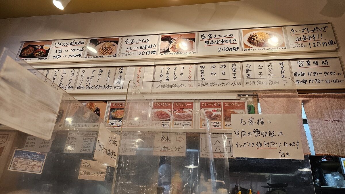 カウンター上のメニューを見てみると、なんと定食のライスをカレーライスに変更できるとか嬉しいサービスもありました。お店のサービス精神が素晴らしすぎる!