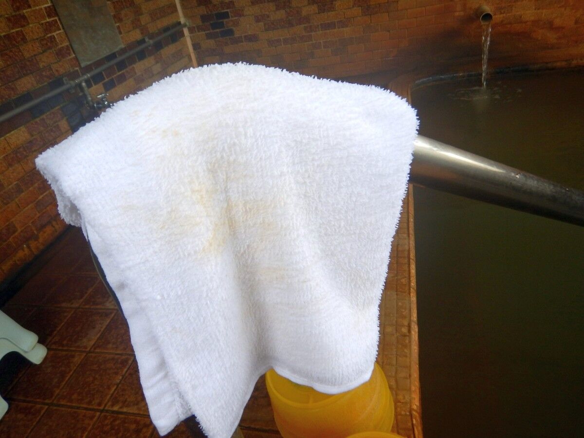 おかげで持ち込んだ白いタオルも茶褐色です。