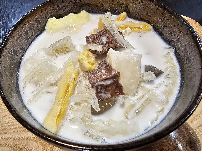 生のドリアンは僕も初めて。このチェーにはドリアンのほか、ゼリー、ロンガン、パラミツといったものが入っているとのこと。でもどれが何やら・・・