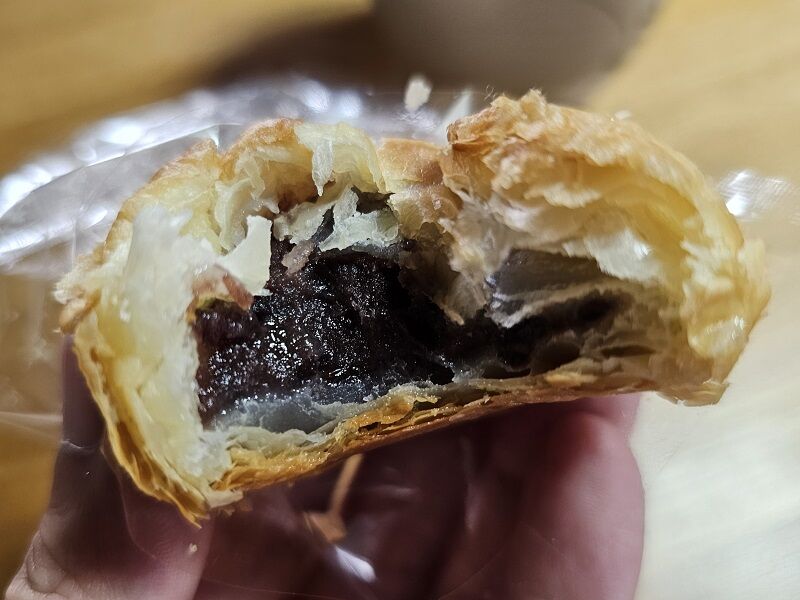 求肥のもちがパイ生地の裏側を包む・・・ いや、コーティングしているかのように敷かれてます。