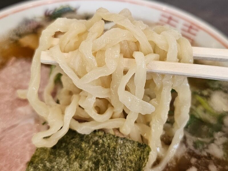 いかにも手打ちといった感のある中細のちぢれ麺。ネットで見たときには、ケンチャンラーメンさんのような感じの麺かと思ったんだけど、実物はそこまでではなかったですね。